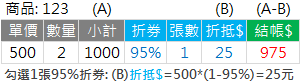 勾選之折價券,將折抵數量=1商品金額。範例: